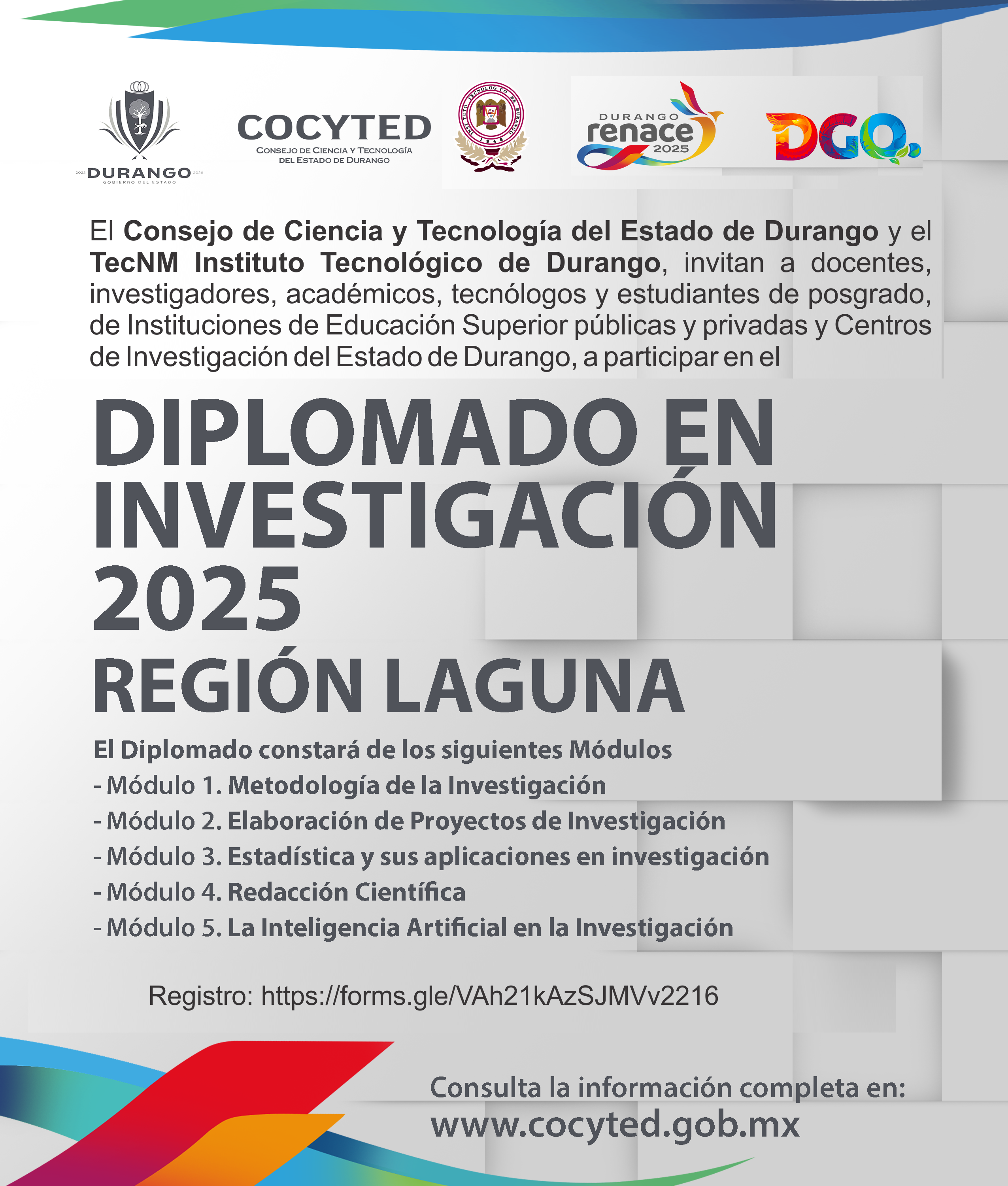 El Consejo de Ciencia y Tecnología del Estado de Durango y el TecNM Instituto Tecnológico de Durango, invitan a docentes, investigadores, académicos, tecnólogos y estudiantes de posgrado, de Instituciones de Educación Superior públicas y privadas y Centros de Investigación del Estado de Durango, a participar en el Diplomado en Investigación 2025.